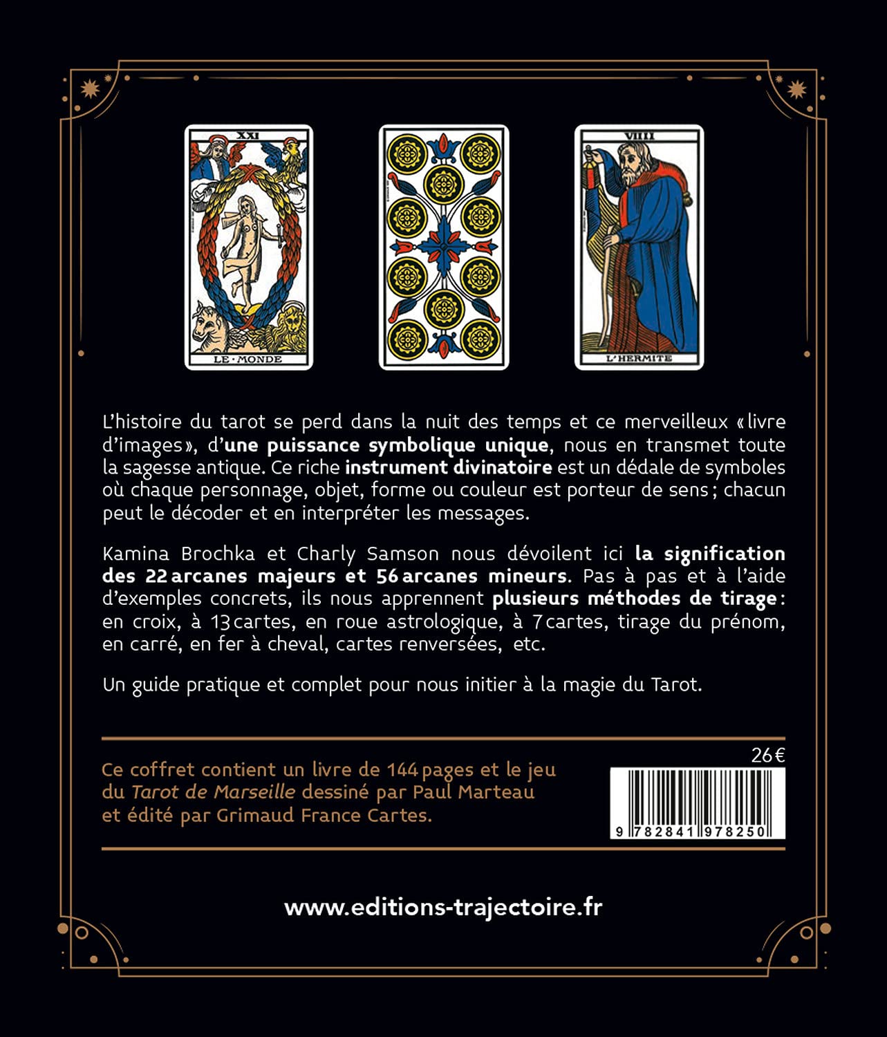 L’histoire du tarot se perd dans la nuit des temps et ce merveilleux « livre d’images », d’une puissance symbolique unique, nous en transmet toute la sagesse antique. Ce riche instrument divinatoire est un dédale de symboles où chaque personnage, objet, forme ou couleur est porteur de sens ; chacun peut le décoder et en interpréter les messages. Kamina Brochka et Charly Samson nous dévoilent ici la signification des 22 lames majeures et 56 lames mineures. Pas à pas et à l’aide d’exemples concrets, ils nous apprennent plusieurs méthodes de tirages.