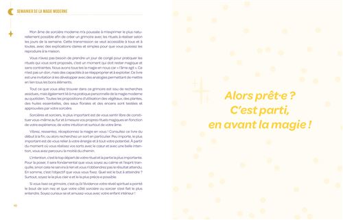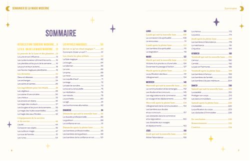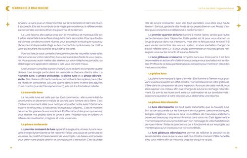 Ce livre s’utilise comme un semainier : chaque jour propose des rituels, sortilèges ou intentions spécifiques à l’énergie du moment. Il est possible de suivre la semaine dans son ensemble ou de piocher librement selon ses besoins.