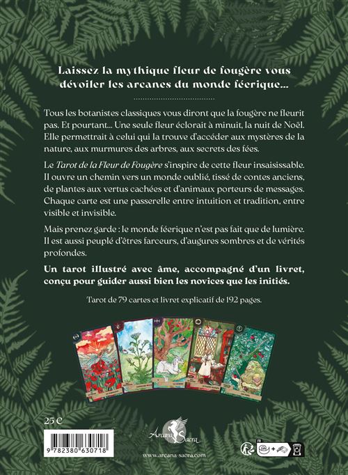 Tarot de la Fleur de Fougère – Coffret est un tarot profondément symbolique et poétique, inspiré des mythes, de la nature et des traditions initiatiques. La fleur de fougère, symbole rare et mystérieux, devient ici une clé d’accès à la connaissance cachée, à l’intuition profonde et aux passages invisibles entre les mondes.